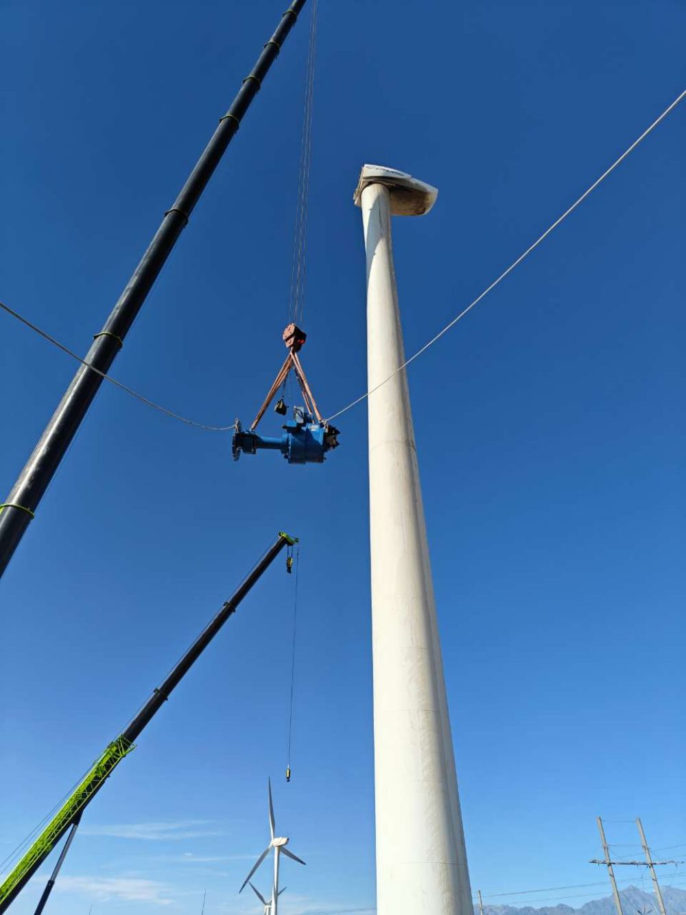 在開展吊裝工作過(guò)程中,專項(xiàng)小組時(shí)刻關(guān)注天氣、風(fēng)速變化等情況,充分利用無(wú)風(fēng)或小風(fēng)“窗口期”,地面與機(jī)艙作業(yè)人員密切配合,嚴(yán)格把控齒輪箱連接油管、聯(lián)軸器、各傳感器、葉輪與主軸連接螺栓、齒輪箱彈性支撐等各關(guān)鍵環(huán)節(jié)安裝工藝,有效保障更換工作安全有序開展。經(jīng)過(guò)連續(xù)奮戰(zhàn),風(fēng)電場(chǎng)掉隊(duì)“成員”終于再次與其他“成員”一起并肩“戰(zhàn)斗”。