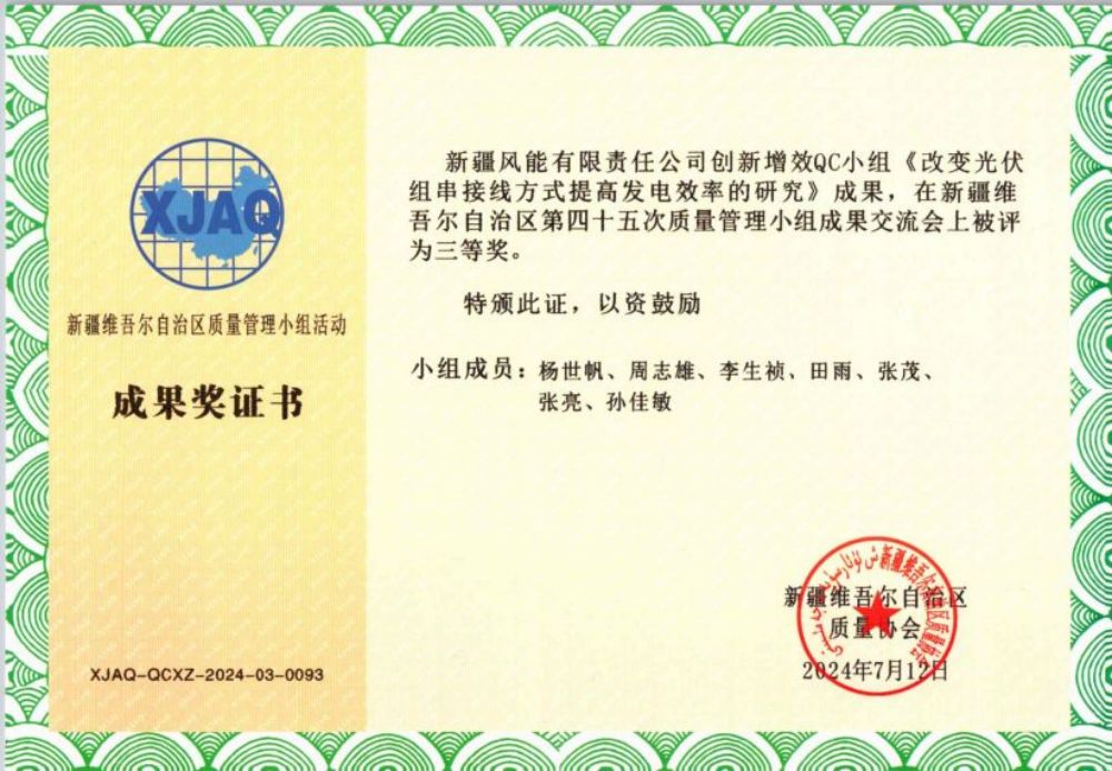 此次交流會(huì)風(fēng)能公司提交了三項(xiàng)Q C課題成果,與來(lái)自全疆各地的289個(gè)優(yōu)秀項(xiàng)目同臺(tái)競(jìng)技。歷經(jīng)專家評(píng)審團(tuán)的嚴(yán)格考察與綜合評(píng)定,最終,公司榮獲“表現(xiàn)突出集體”的稱號(hào)。其中“改變光伏組串接線方式提高發(fā)電效率的研究”項(xiàng)目喜獲三等獎(jiǎng),成為公司質(zhì)量管理與技術(shù)創(chuàng)新征程上一座新的里程碑。