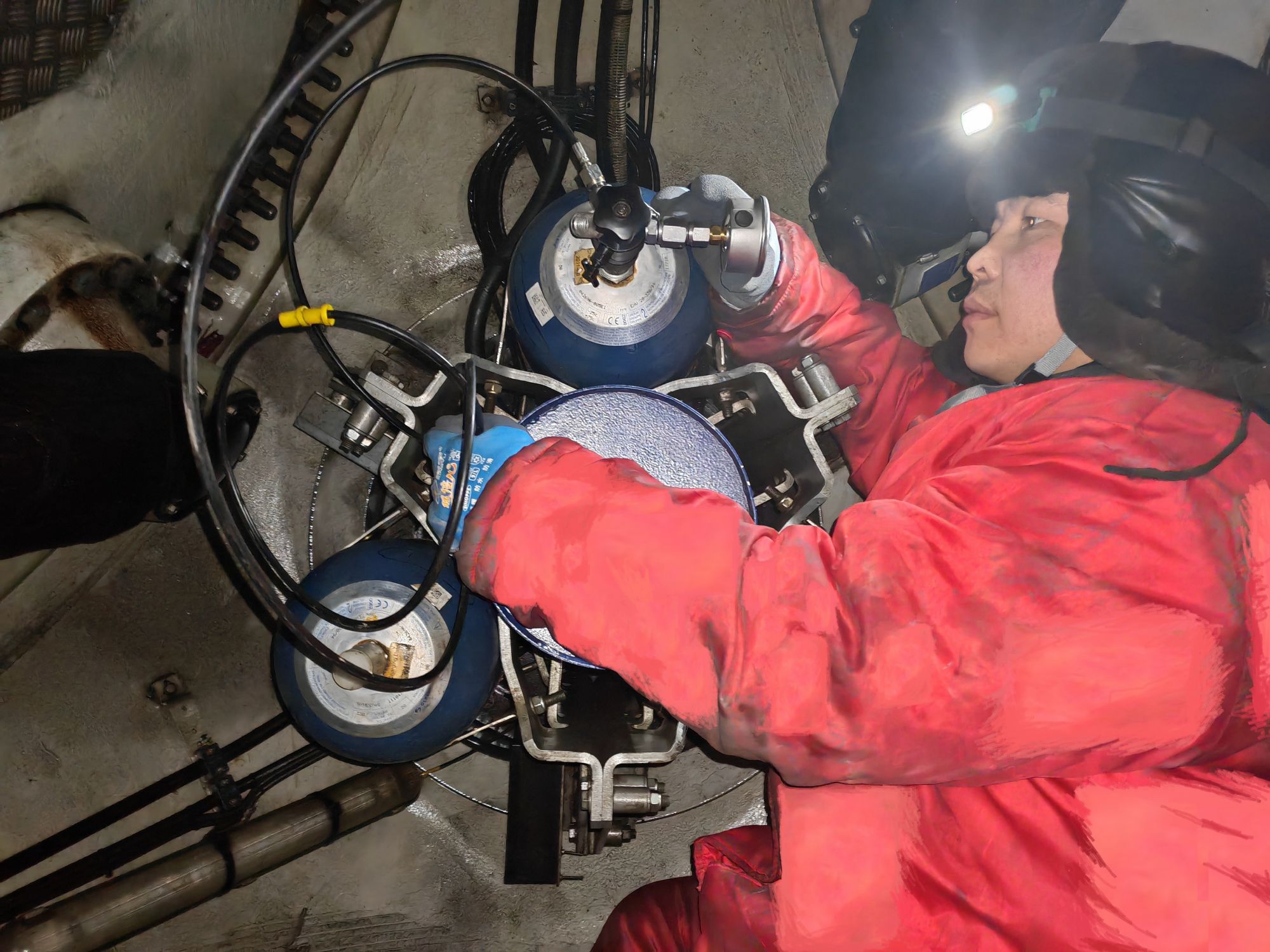圖3檢修人員在輪轂中對變槳蓄能器進行檢測并充裝氮氣